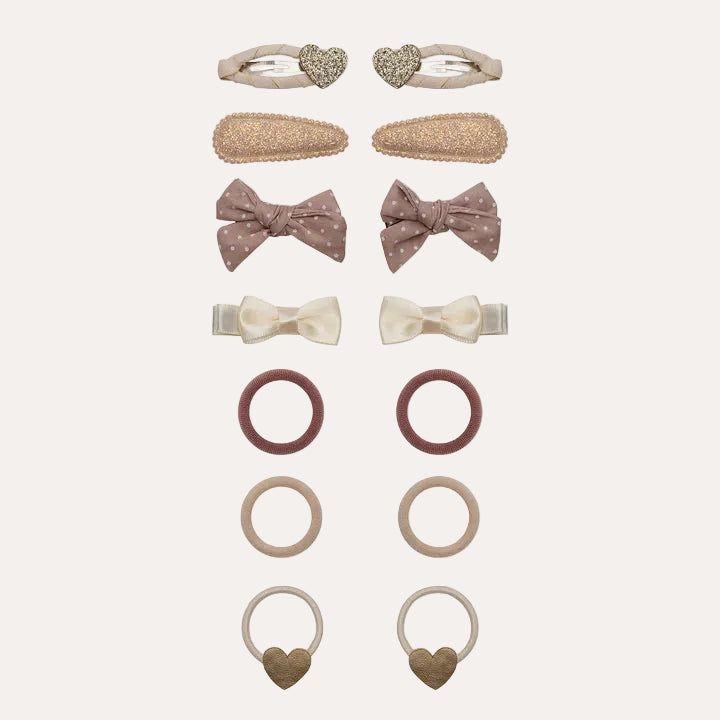 Get ready for hairstyle adventures! This delightful seven-piece starter collection features gentle, neutral-toned accessories designed for little explorers discovering their own look. With a variety of styles to choose from, there's something perfect for every mood and outfit. Soft, safe, and endlessly fun—the ideal first step into creative self-expression!