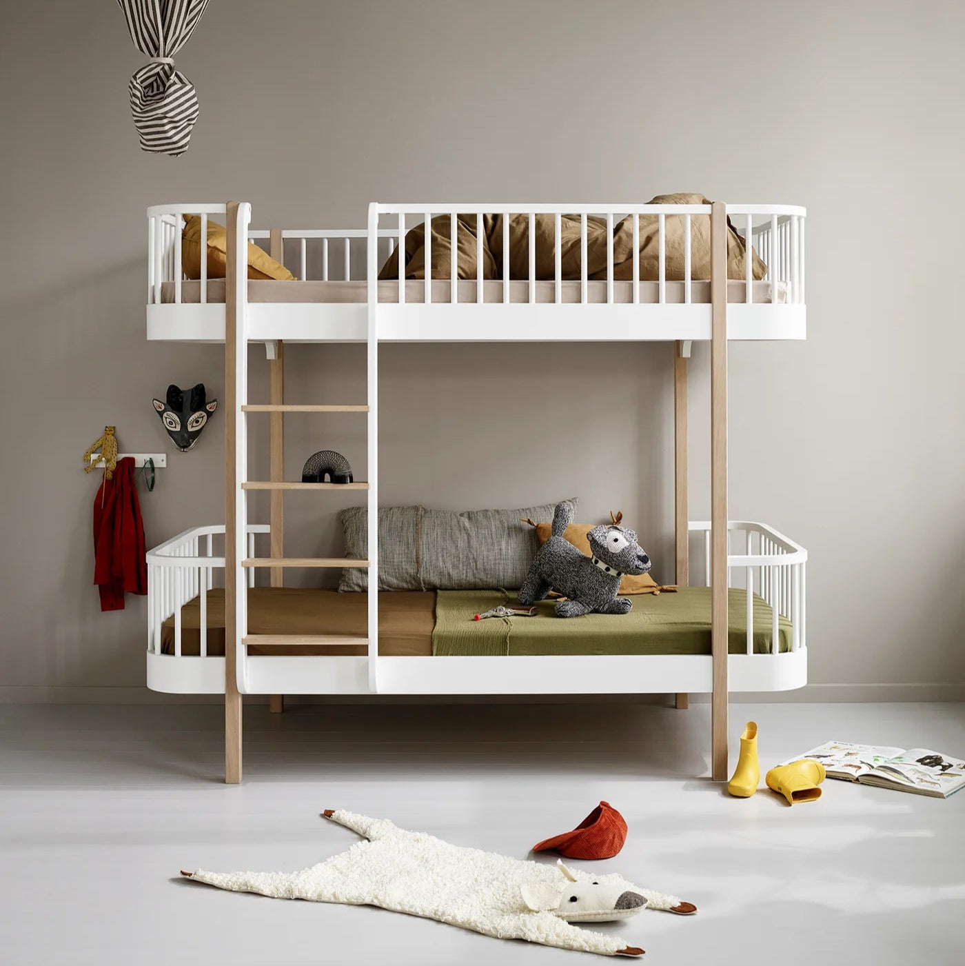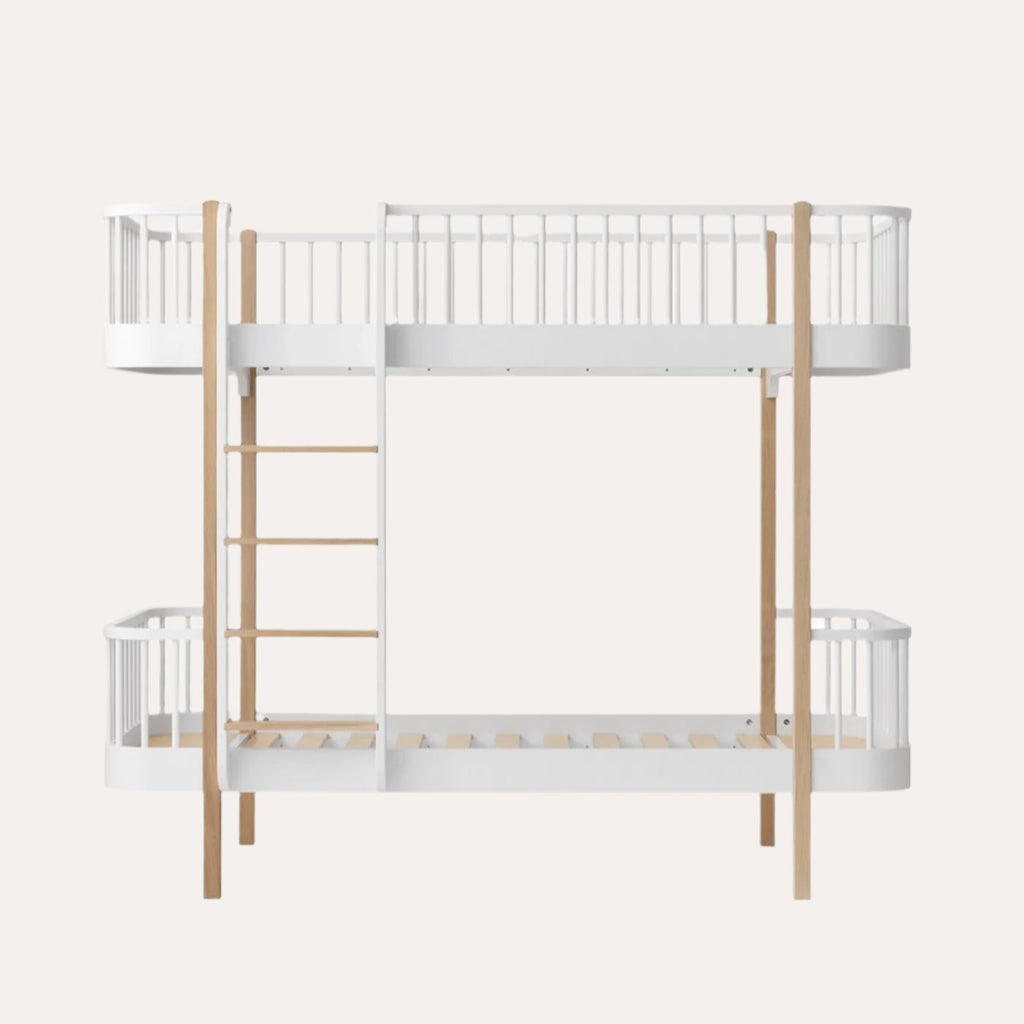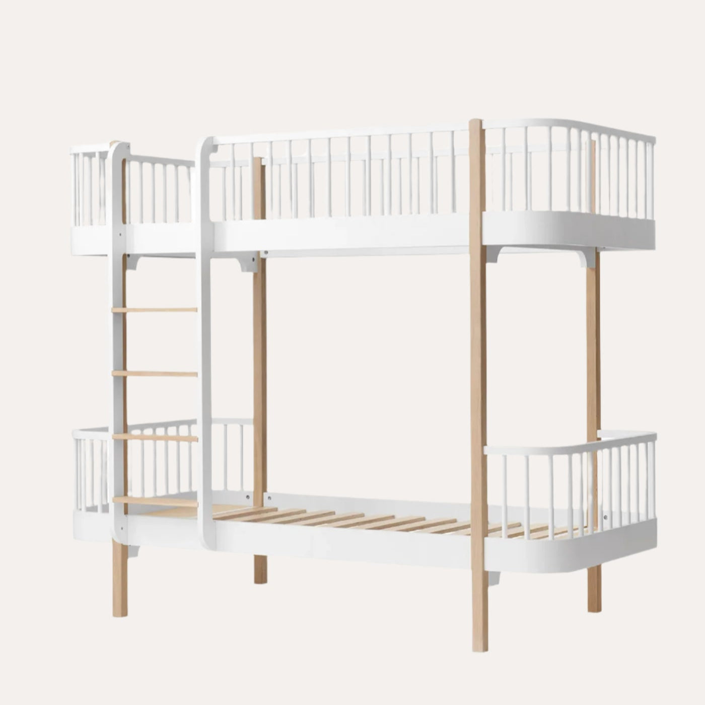 The Wood Original series bunk bed combines modern aesthetics with a nostalgic touch reminiscent of the 50s. Its design evokes the charm of old trams, featuring distinctive bars and rounded corners that add to its unique appeal. Additionally, the bunk bed can be complemented with a bed guard and a bed drawer for added functionality. The ladder is positioned on the left side of the bed, providing convenient access to the top bunk.