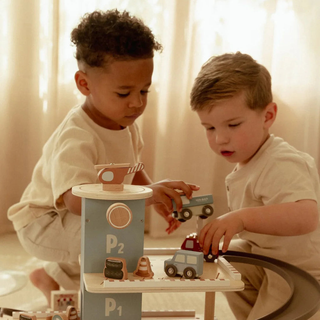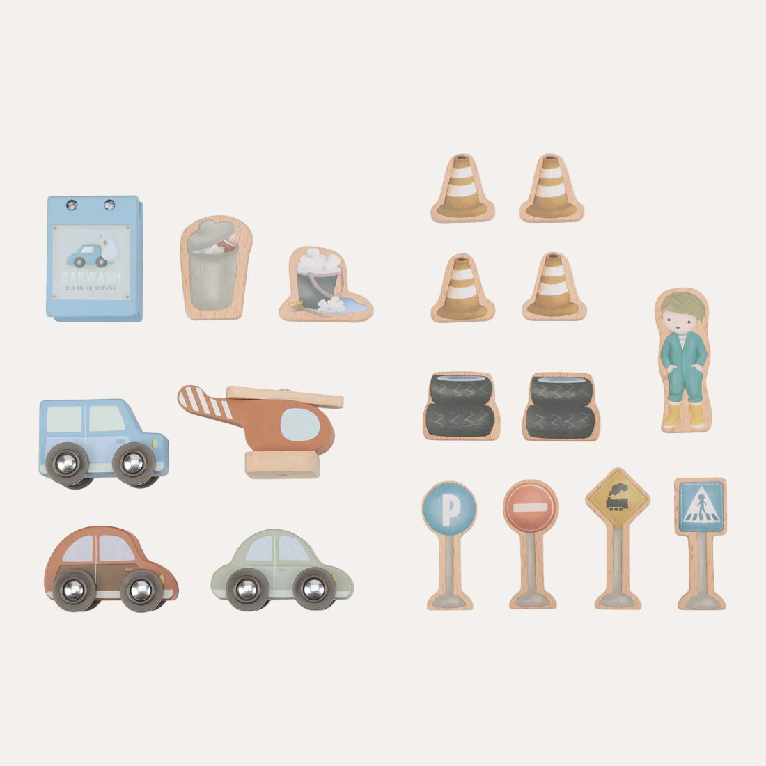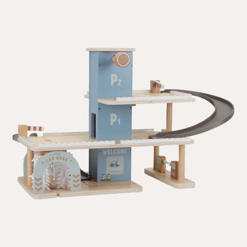 Park, refuel, and race off! This wooden toy garage is a fantastic addition to the Little Dutch Train Track XL. It features a car wash on the ground floor, two parking levels, and an electric charging station, topped with a helicopter landing pad. Comes with wooden accessories like traffic signs, stacked tires, and a bucket, plus three vehicles and a helicopter. Drive in, park your car, or take off by air—endless adventures await!
