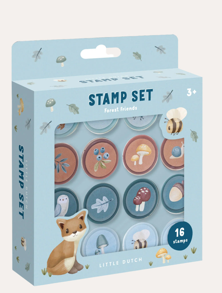 Inspire your child's imagination with the Self-inking Forest Friends stamps. This set features 16 unique stamps, such as an adorable owl, spiky hedgehog, and clever fox, as well as fun elements like blueberries, mushrooms, and a buzzing bee. The built-in ink means hassle-free use, perfect for children aged 3 and up to practice their fine motor skills and foster creativity.