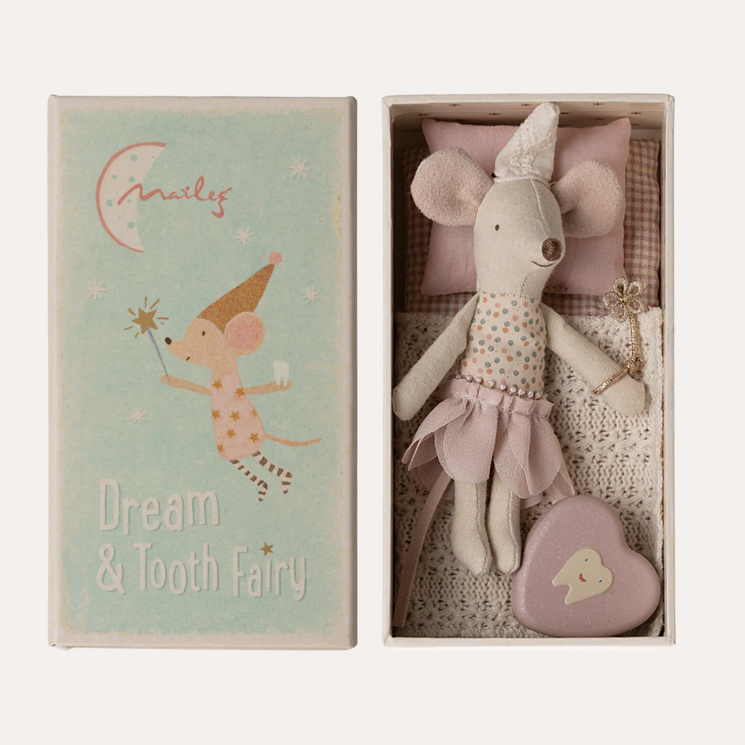 Meet the Tooth Fairy Mouse, Little Sister, your magical nighttime companion! Dressed in enchanting attire and tucked snugly into soft bedlinen inside a cozy matchbox, she’s ready to sprinkle fairy dust, collect lost teeth, and deliver sweet treats while ensuring you have the sweetest dreams. This delightful set includes a tiny tooth box and a charming matchbox bed, perfect for little hands to hold and treasure. Fabrics may vary, adding a unique touch to each fairy’s outfit. Bring home this playful little helper and let the magic of the tooth fairy brighten bedtime!