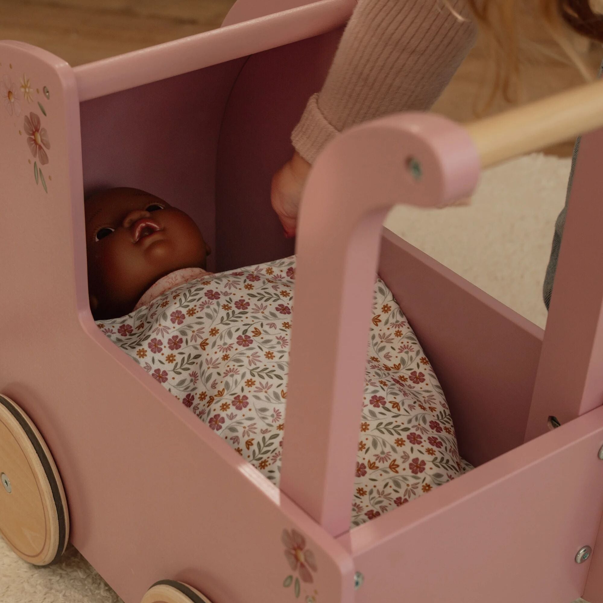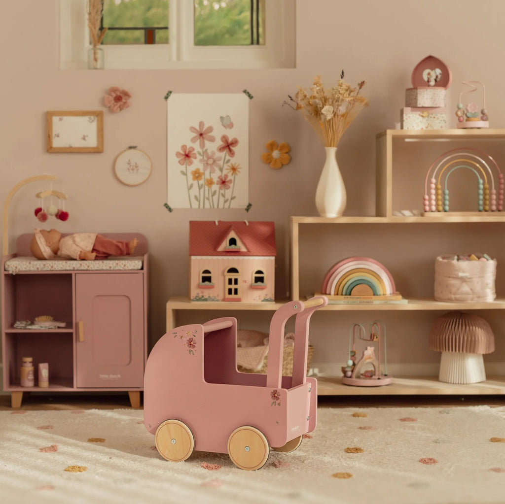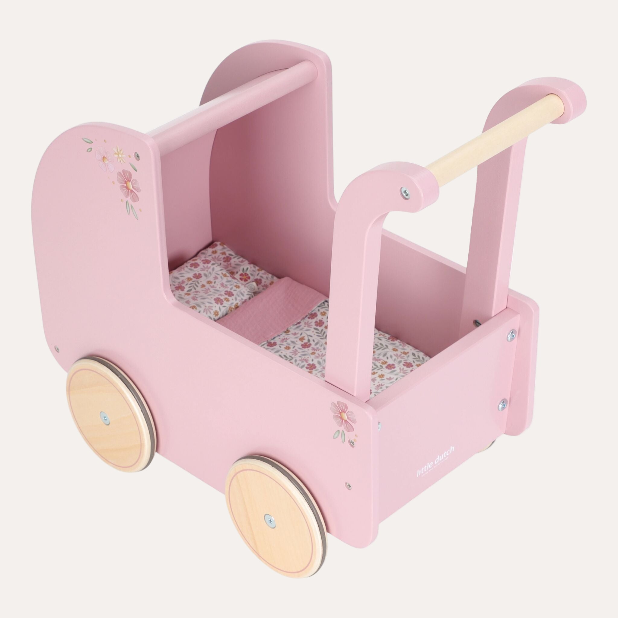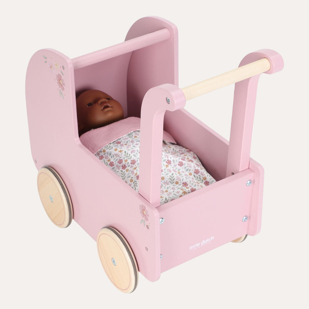 This beautiful wooden doll pram combines nostalgic charm with stylish details. Decorated with elegant floral illustrations and featuring a soft pillow, warm blanket, and cozy mattress in the Soft Flowers design, it’s perfect for little doll parents who love to care in style. Smooth-rolling rubber wheels protect your floors while ensuring easy movement. A timeless toy that invites years of imaginative play and heartfelt journeys with your favourite dolls!