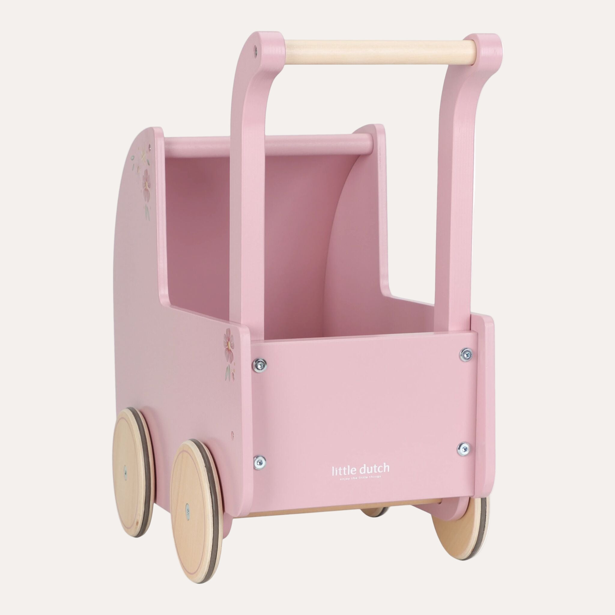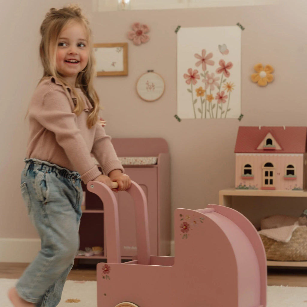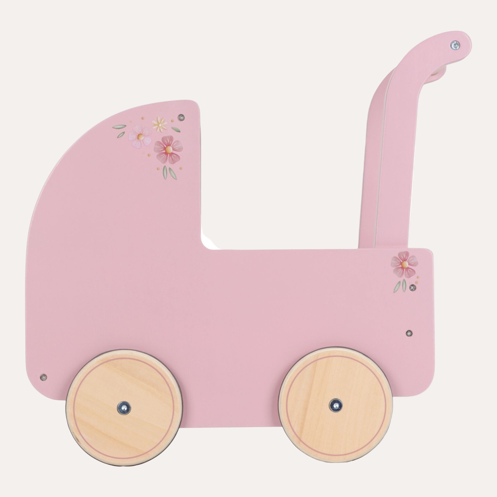 This beautiful wooden doll pram combines nostalgic charm with stylish details. Decorated with elegant floral illustrations and featuring a soft pillow, warm blanket, and cozy mattress in the Soft Flowers design, it’s perfect for little doll parents who love to care in style. Smooth-rolling rubber wheels protect your floors while ensuring easy movement. A timeless toy that invites years of imaginative play and heartfelt journeys with your favourite dolls!
