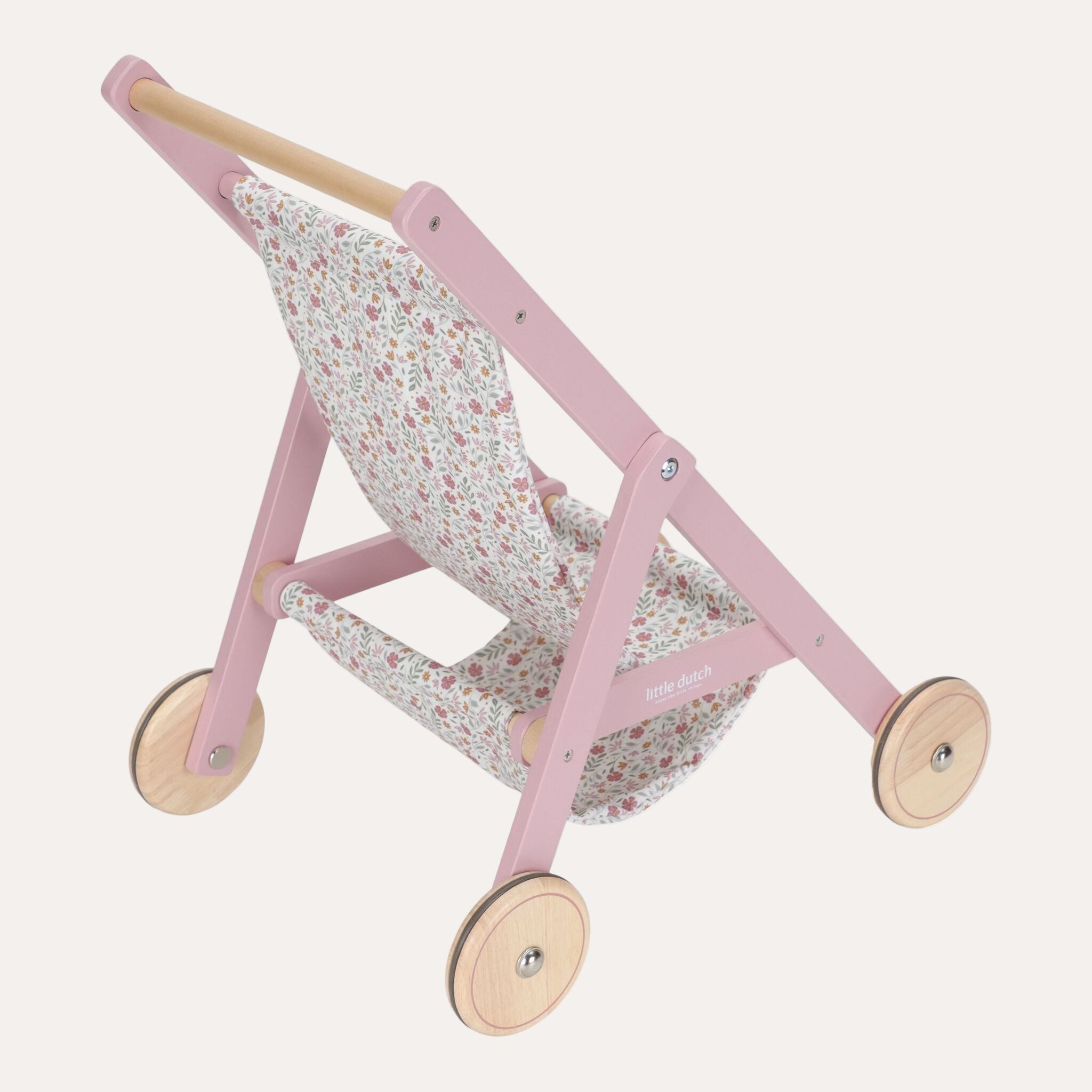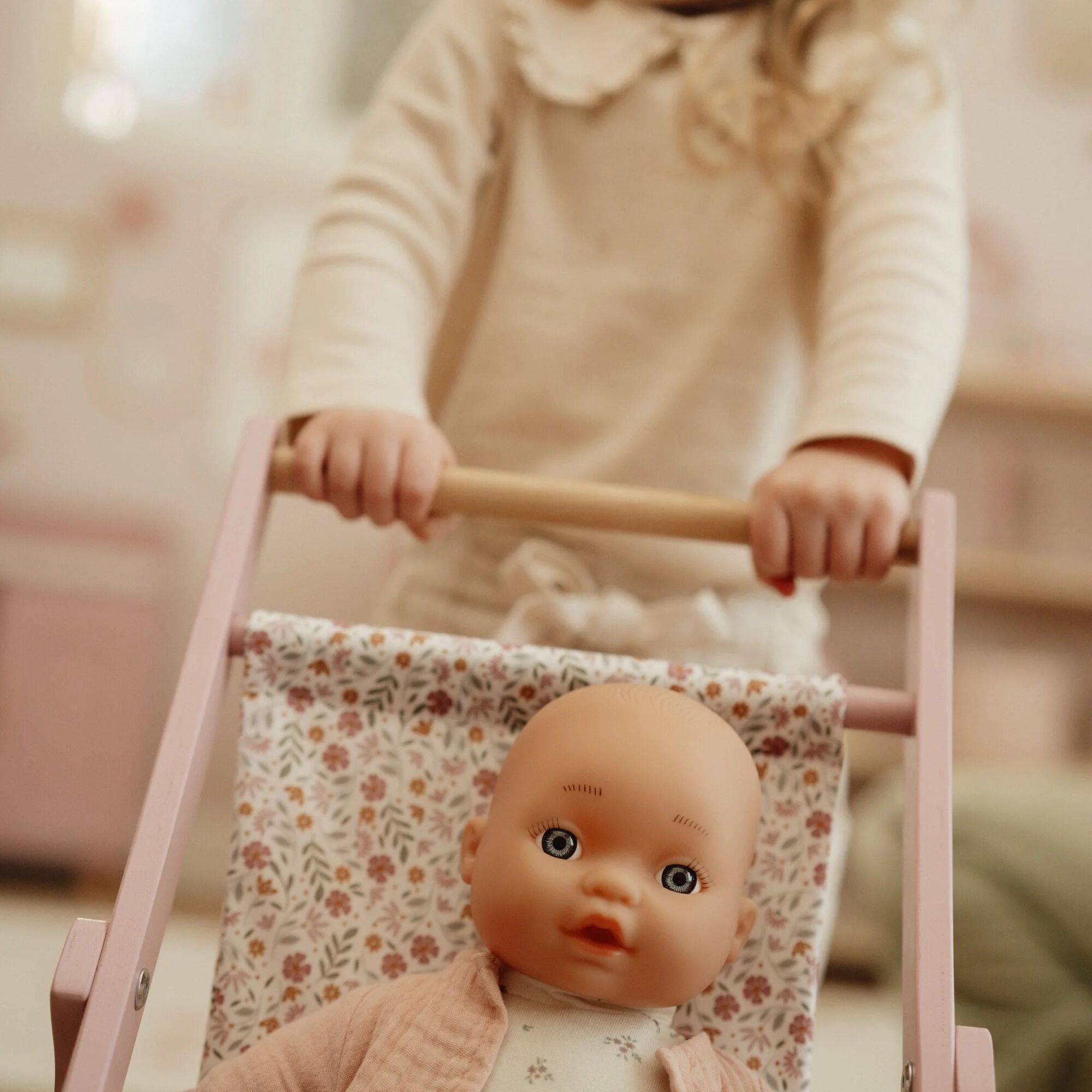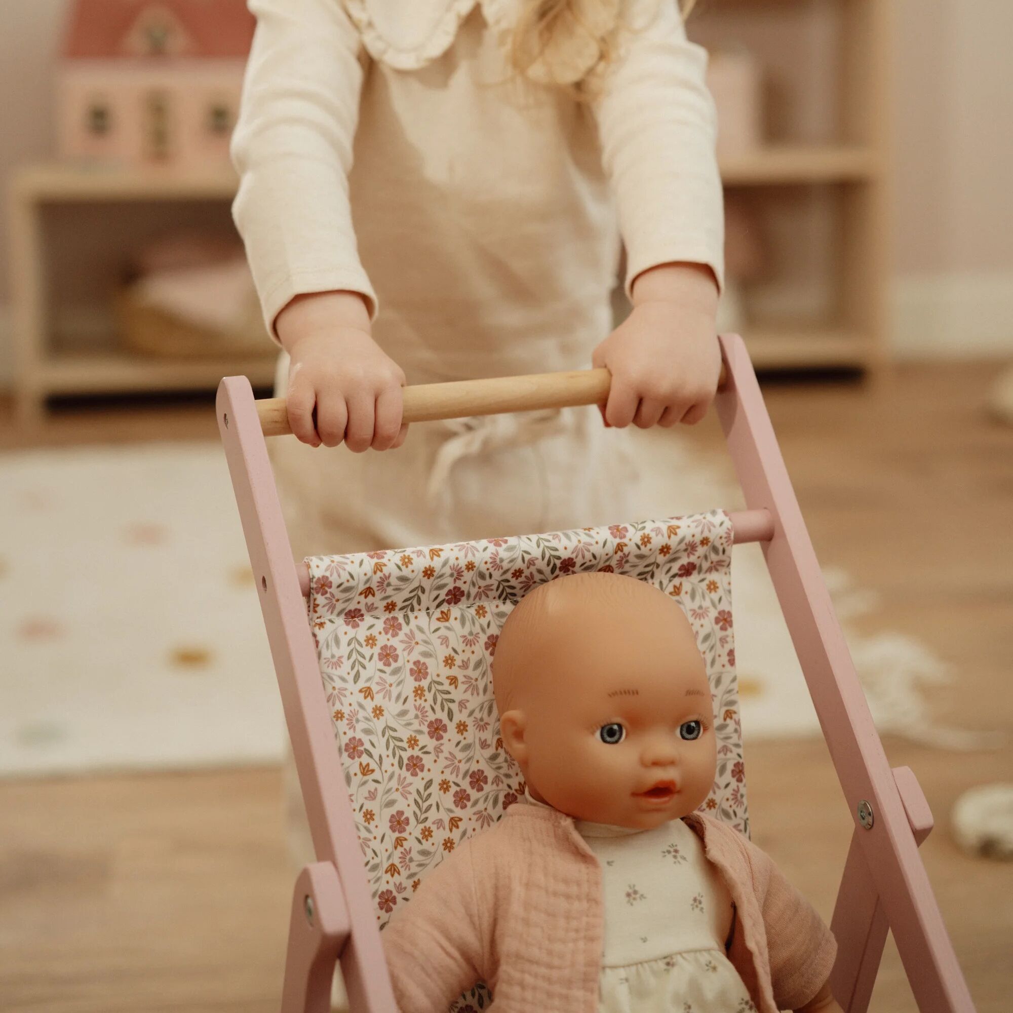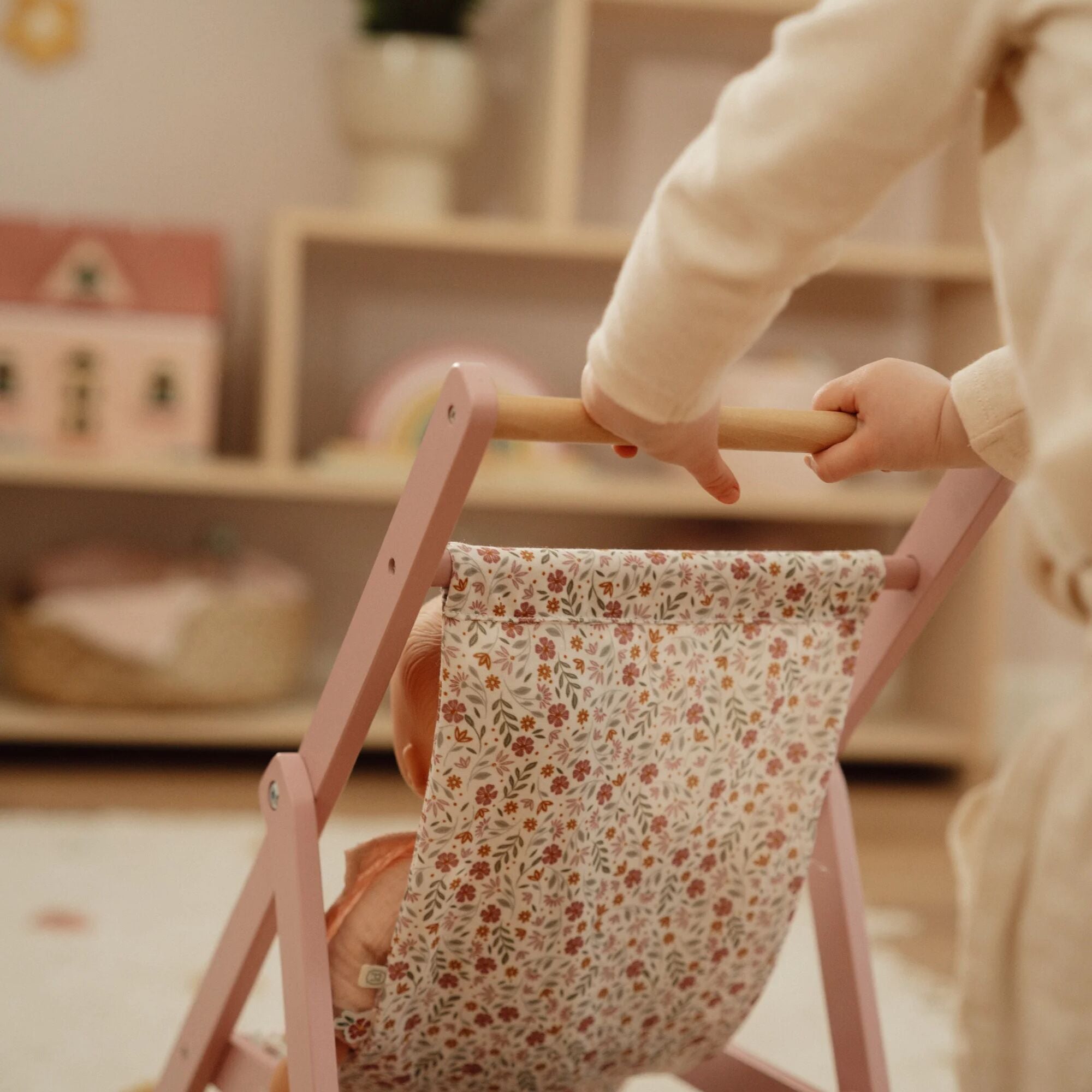 Take your doll on endless adventures with this charming wooden doll stroller! Its sturdy wooden frame and rubber wheels ensure smooth rolling while protecting your floors. Featuring a sweet Soft Flowers seat design, it adds a touch of whimsy to every stroll. Perfect for indoor or outdoor play, this stroller makes sure your doll travels in comfort wherever imagination leads you. Let the fun walks begin!