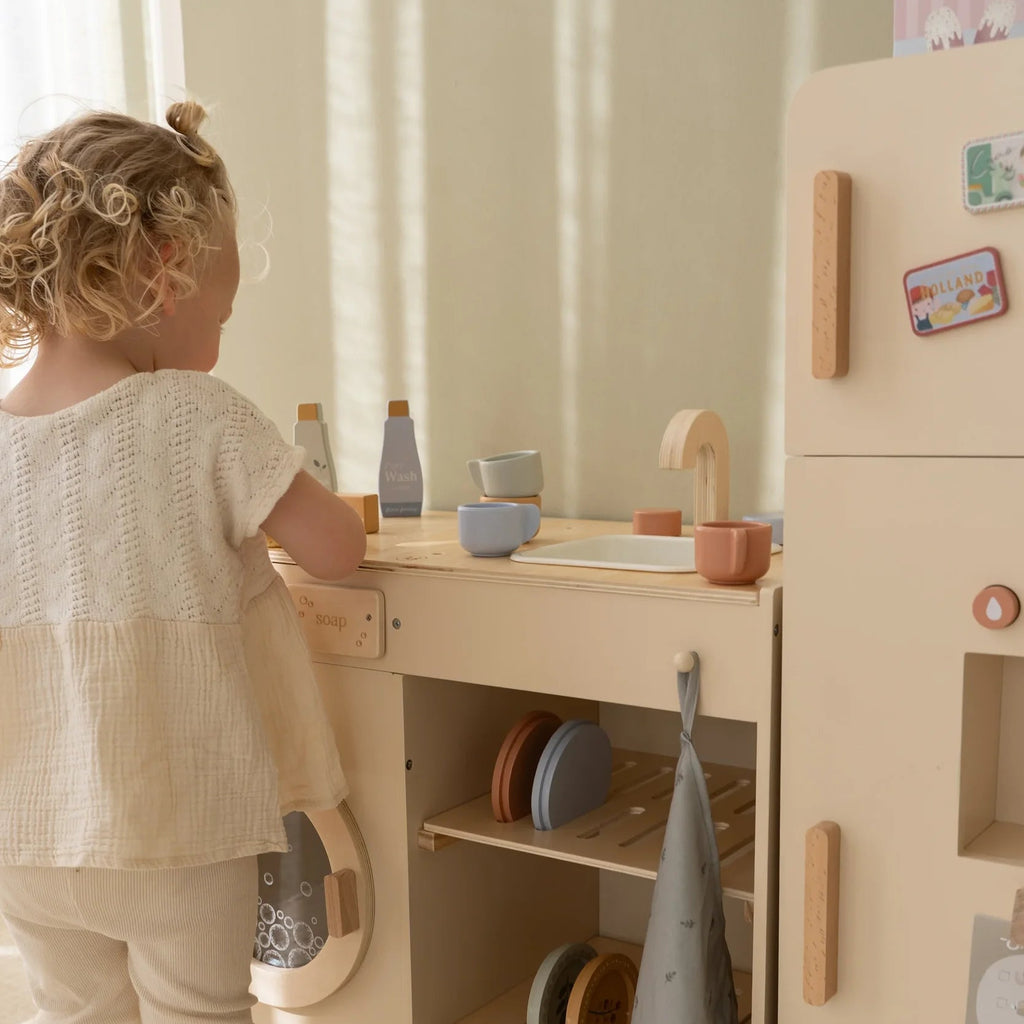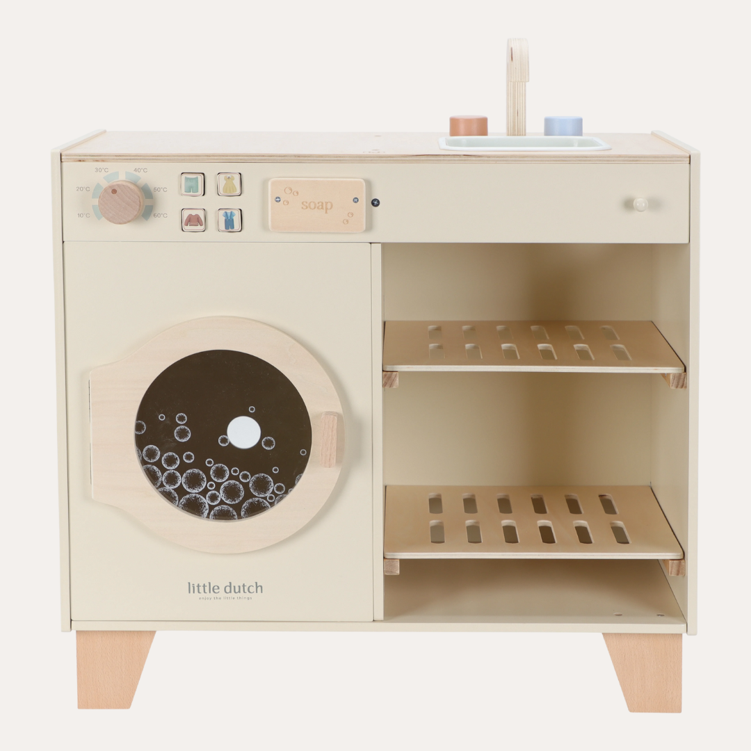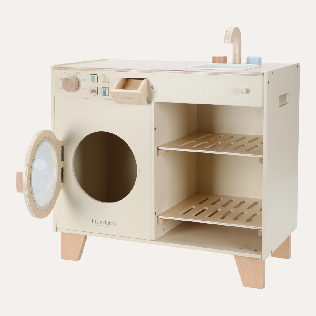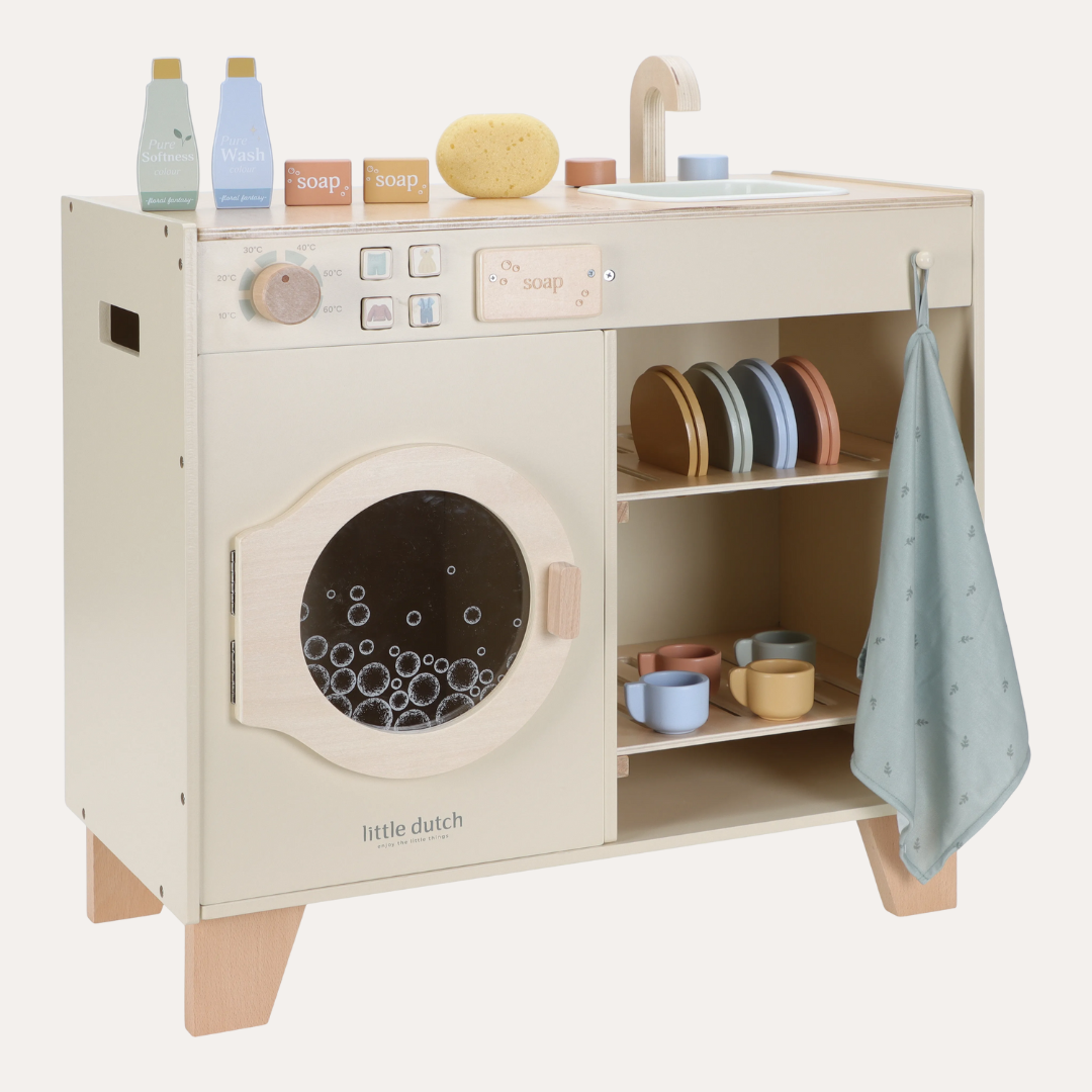 The illustrated push buttons and a special soap compartment add extra excitement. Pair it with a play cooking station and fridge to create a full kitchen corner.