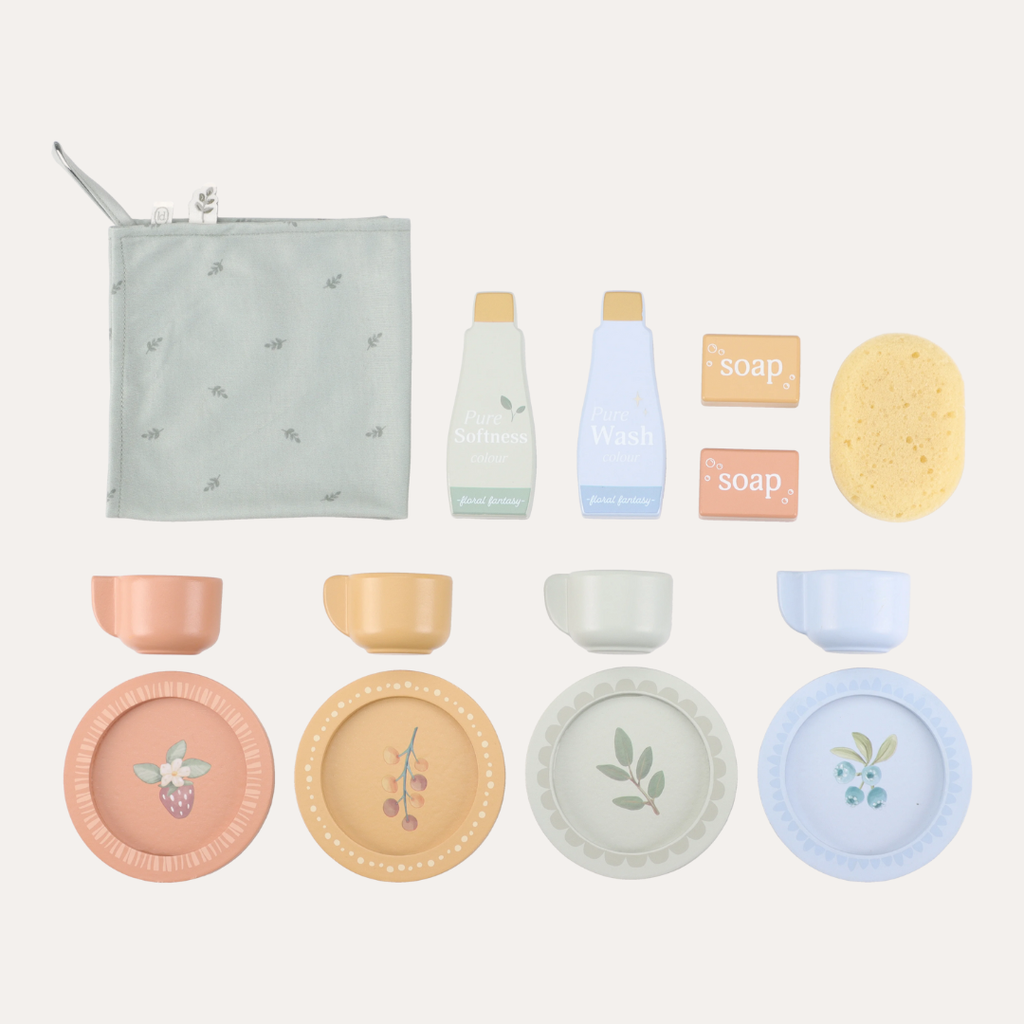 It includes four cups, four saucers, two plates, detergent, soap blocks, and a tea towel for playful cleaning fun. Kids can wash dishes in the sink and freshen their doll’s clothes in the washing machine.